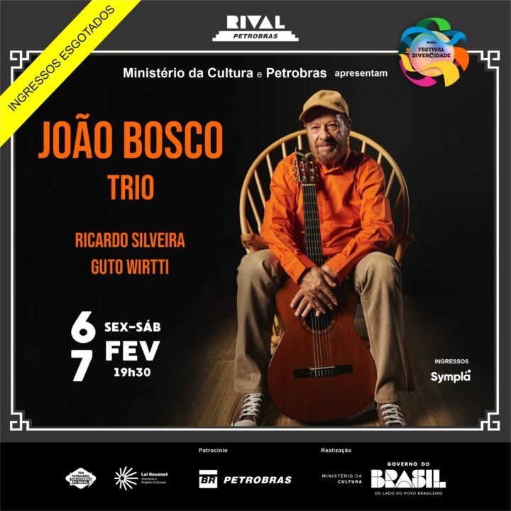 O consagrado cantor, compositor e violonista João Bosco sobe novamente ao palco do Teatro Rival Petrobras nos dias 6 e 7 de fevereiro, para duas noites especiais em formato de trio. A seu lado, estarão os músicos de longa parceria – o guitarrista Ricardo Silveira e o contrabaixista Guto Wirtti – numa formação intimista e afetiva, perfeita para revisitar clássicos da carreira e celebrar a história viva da música deste grande nome da MPB.